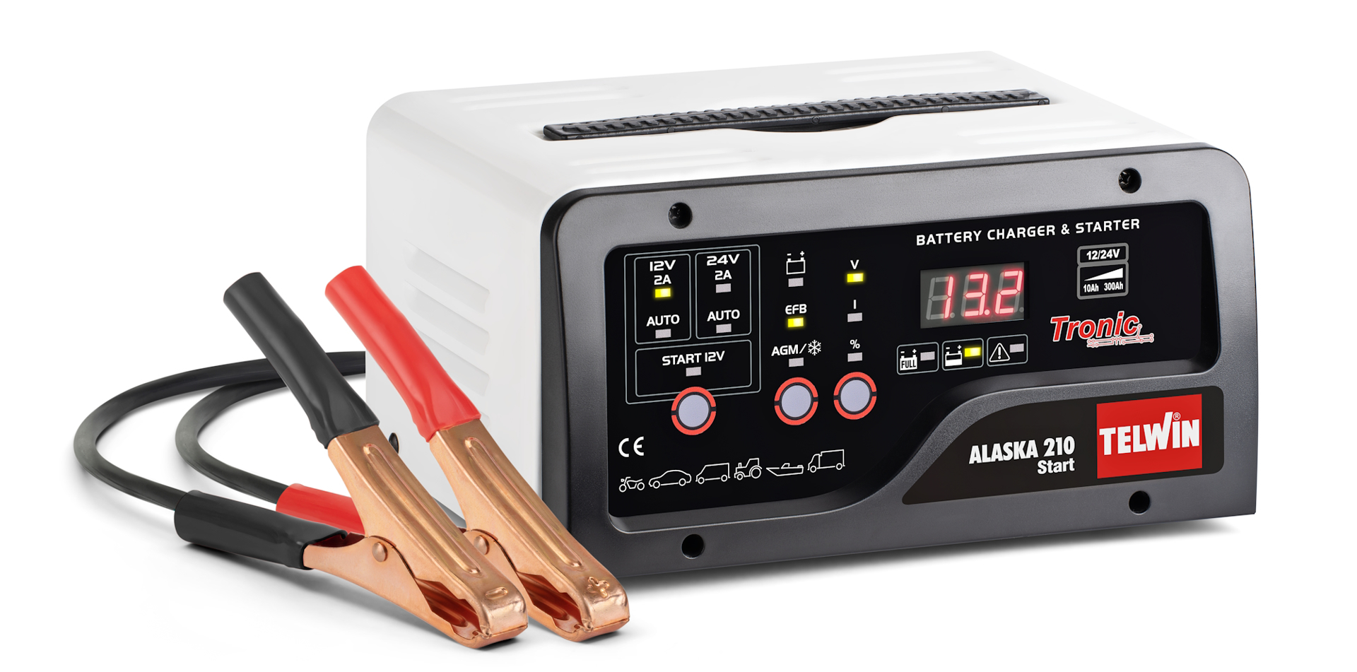Elektronická nabíječka s podporou startu Alaska 210 Telwin, 12/24 V/23 A s pomocným startem max. 150 A pro akumulátory 25-300 Ah, vhodná pro osobní automobily.