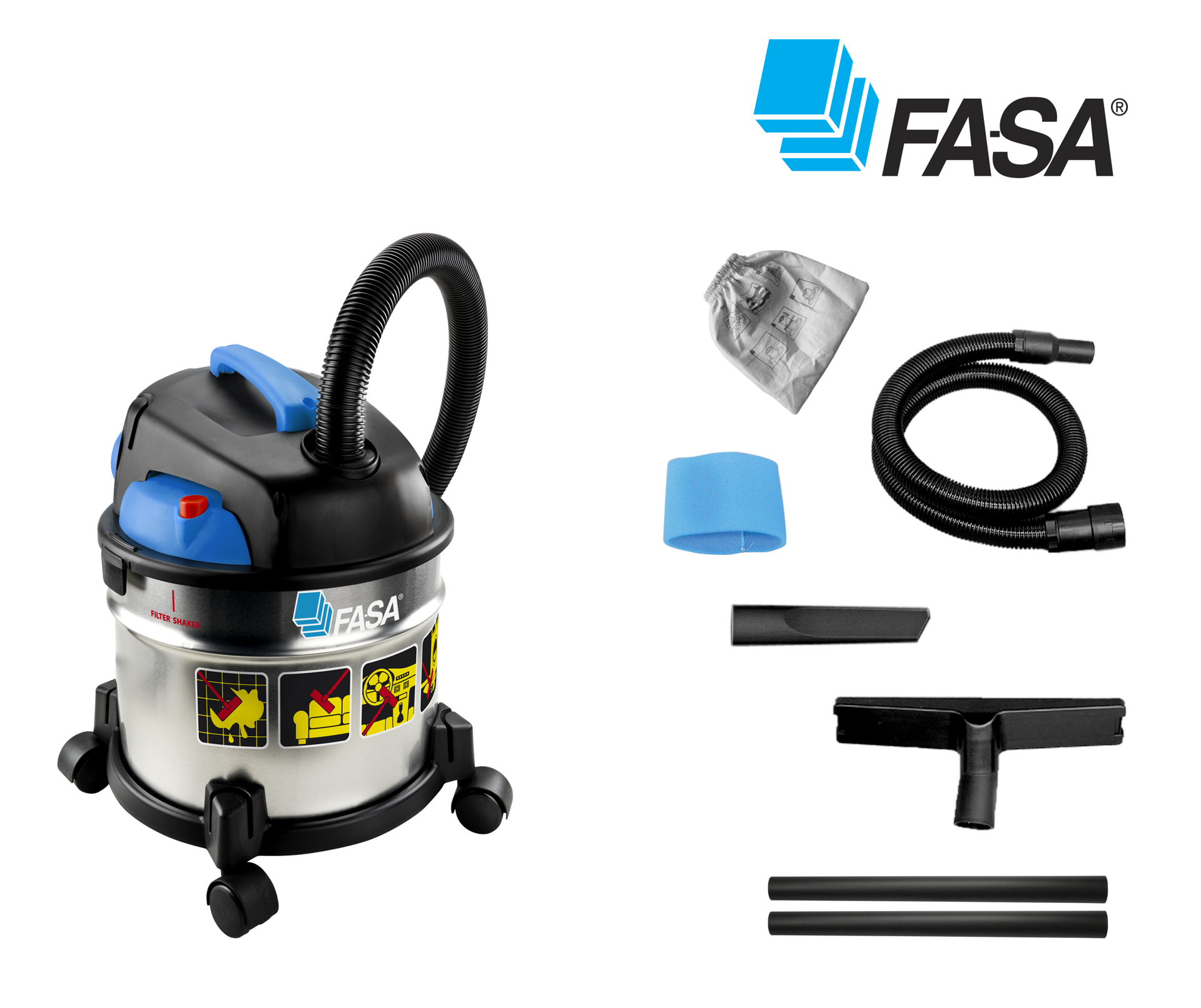 Lehký vysavač WS 20 FASA, Inox - pro suché a mokré vysávání, motor max. 1200 W, odpadní nádoba 20 lt, včetně příslušenství. Ideální velikost vysavače pro vysávání interiérů aut apod. Made in Italy