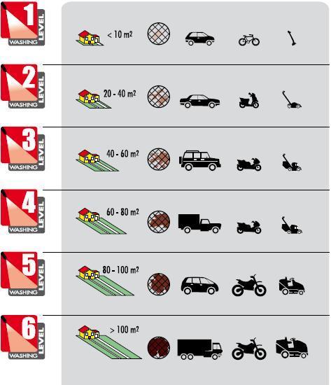 - Intenzita používání: důležité je, jak intenzivně budete myčku používat. Výrobce tlakových myček Lavorwash S.p.A. Italy dělí intenzitu používání do 6 úrovní. Na konci stránky je i piktogramové znázornění vhodnosti použití myčky s různou intenzitou zátěže.